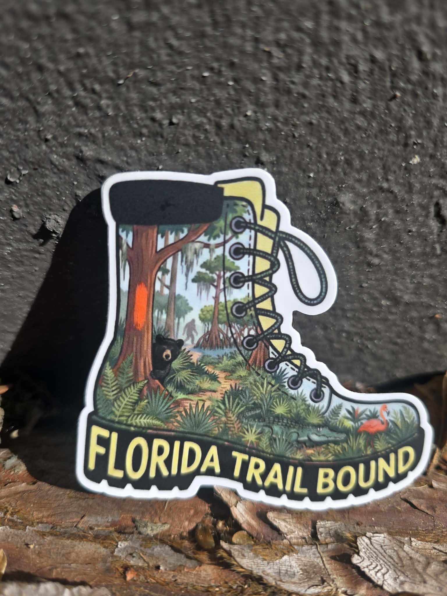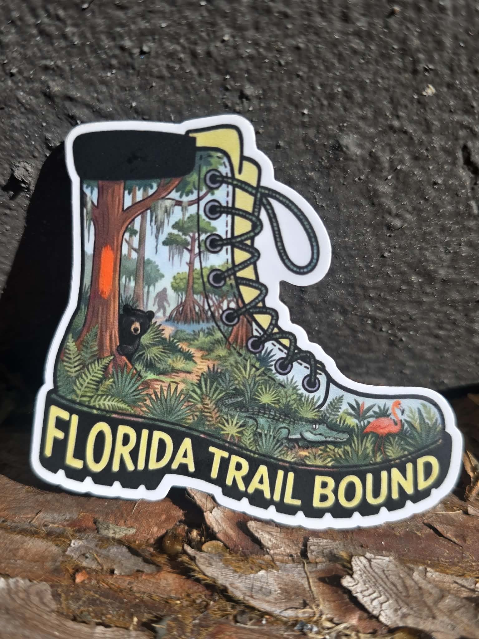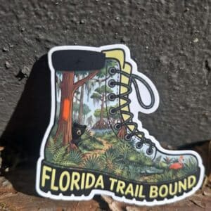 From sandy tread to moss-draped forests and winding boardwalks, this sticker captures the excitement of heading toward your next Florida Trail adventure. Shaped like a rugged hiking boot, the “Florida Trail Bound” sticker features a detailed woodland scene with blaze-marked trees, native wildlife, and lush greenery. Rich colors and bold lettering bring Florida’s wild landscapes to life, while durable vinyl makes it trail-ready.