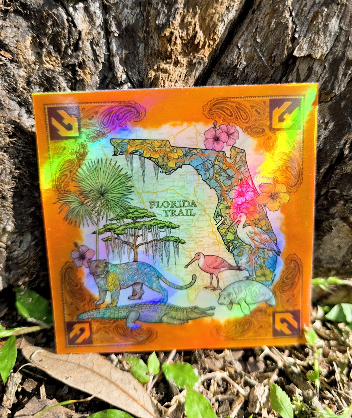 Featuring a colorful illustrated map of Florida filled with iconic wildlife and flora—including manatee, alligator, spoonbill, panther, egret, and tropical blooms—this holographic sticker shimmers with every angle, making it an instant eye-catcher! The radiant finish brings the Florida Trail Tails design to life, capturing the spirit of adventure and the wild beauty found along the trail.