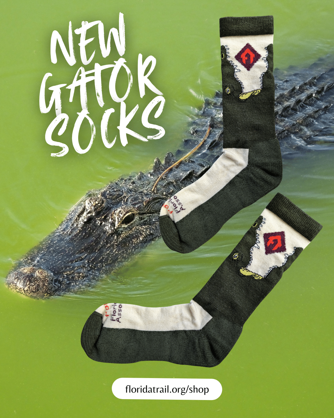 Get ready for your next adventure with our new Gator Crew Socks! Inspired by the iconic gators of the Florida Trail, these crew-length socks are made with a comfortable and durable merino wool blend. They feature a unique green design with a gator pattern and our classic diamond logo.
