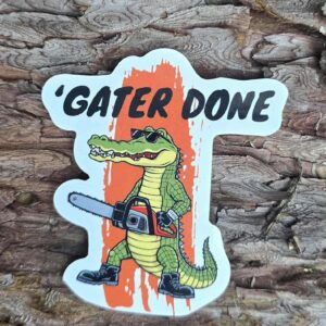 This bold design features a tough, sunglasses-wearing cartoon gator striding confidently with a chainsaw in hand, set against a Florida Trail blaze backdrop and topped with the phrase “Gater Done.” Durable, vibrant, and full of personality, it’s built to hold up through heat, humidity, and plenty of outdoor miles. 2.5″ X 2.5″