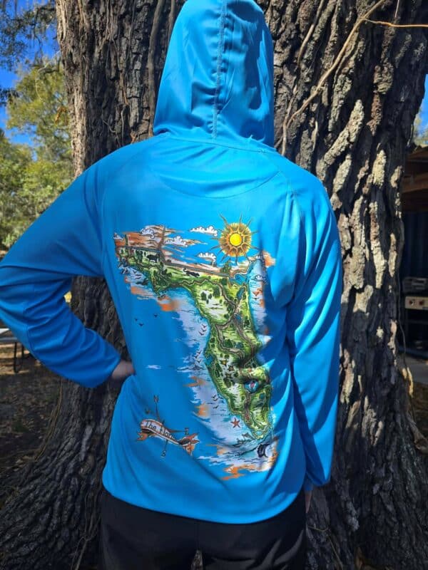 Celebrate your love for the Florida Trail with this lightweight, moisture-wicking hoodie featuring a beautiful Caribbean blue color and custom artwork. The back showcases an illustrated map of the Florida Trail, while the front features the Florida Trail Association logo. Made for the outdoors, this sun hoodie moves with you whether you’re trekking through swamps, blazing trail, or hanging with friends after the hike.
