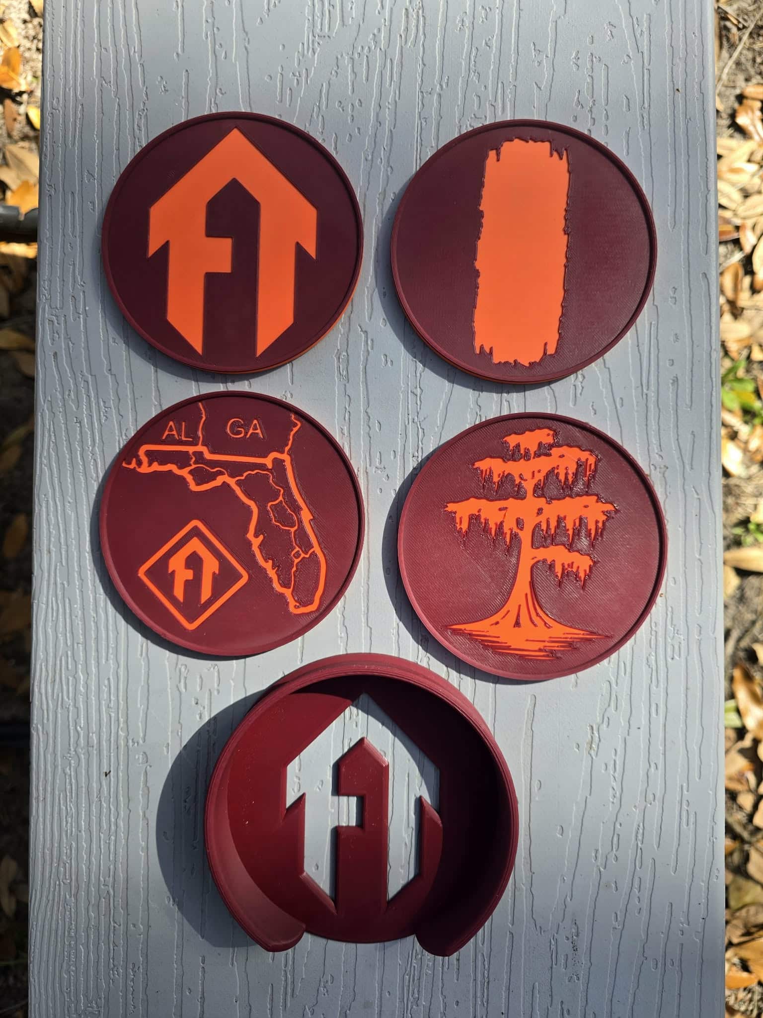 Each set includes four coasters featuring iconic Florida Trail inspired designs. From the bold blaze symbol to a map of Florida and a classic cypress tree silhouette, the deep trail-maroon base paired with bright blaze-orange details gives them a rugged, outdoorsy look that stands out on any table. The set also comes with a matching holder to keep everything neatly stacked and ready for your next round of drinks.