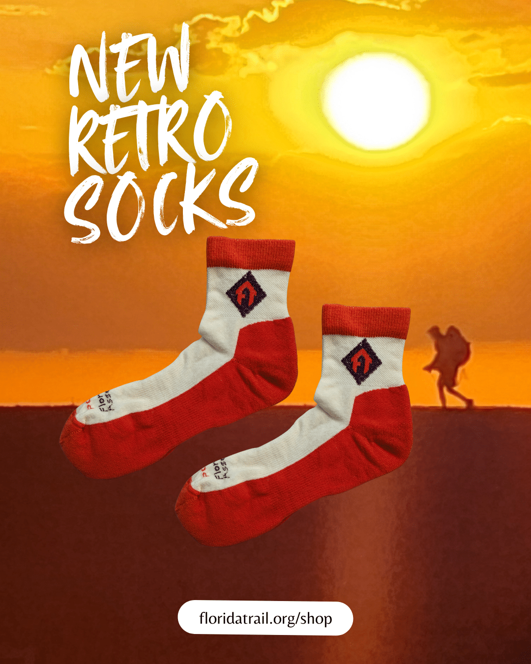 Inspired by our vintage logo, the new Retro Socks are here! These quarter-crew socks are made with a comfortable and durable merino wool blend, perfect for your next adventure. Featuring an eye-catching design with a vibrant orange cuff and our classic diamond logo, they are a great way to show your support for the Florida Trail.