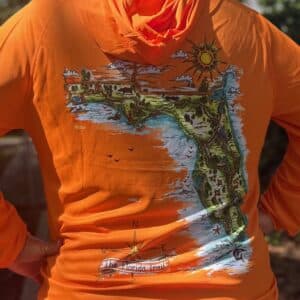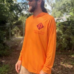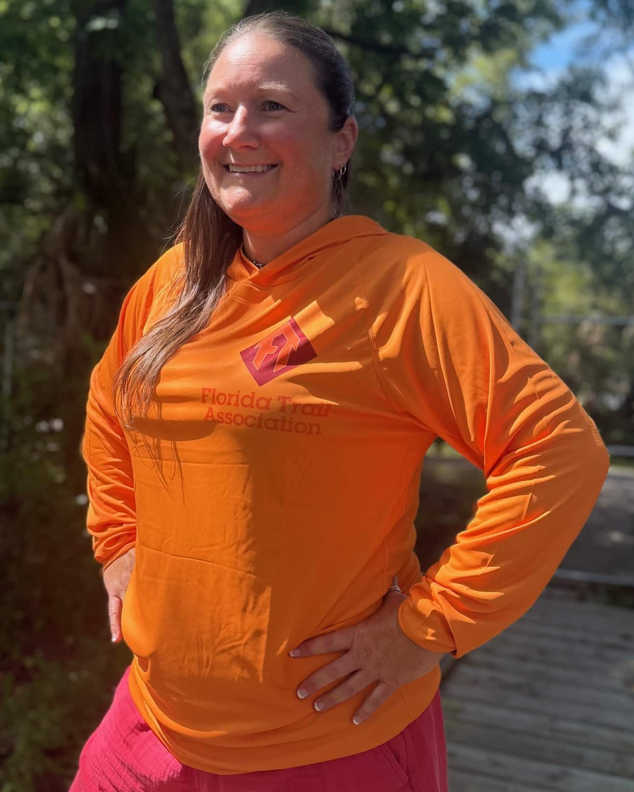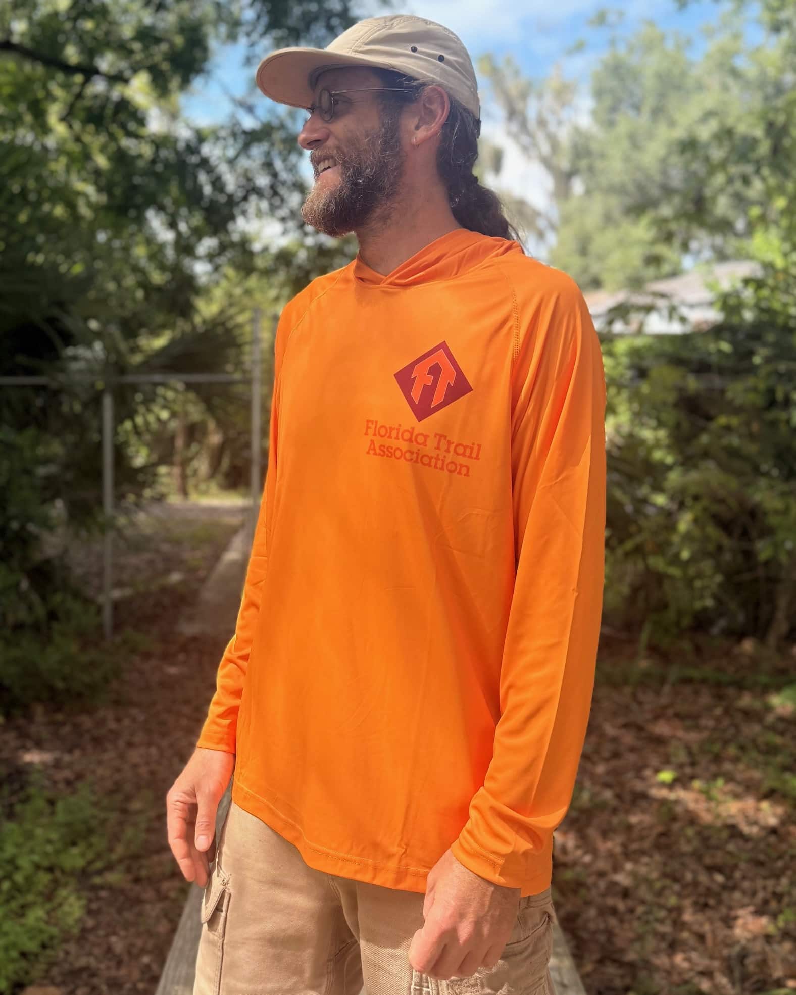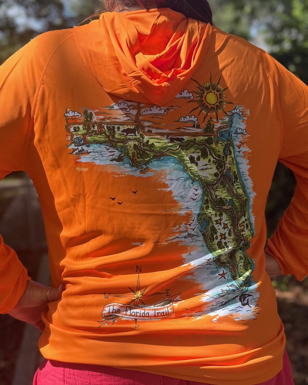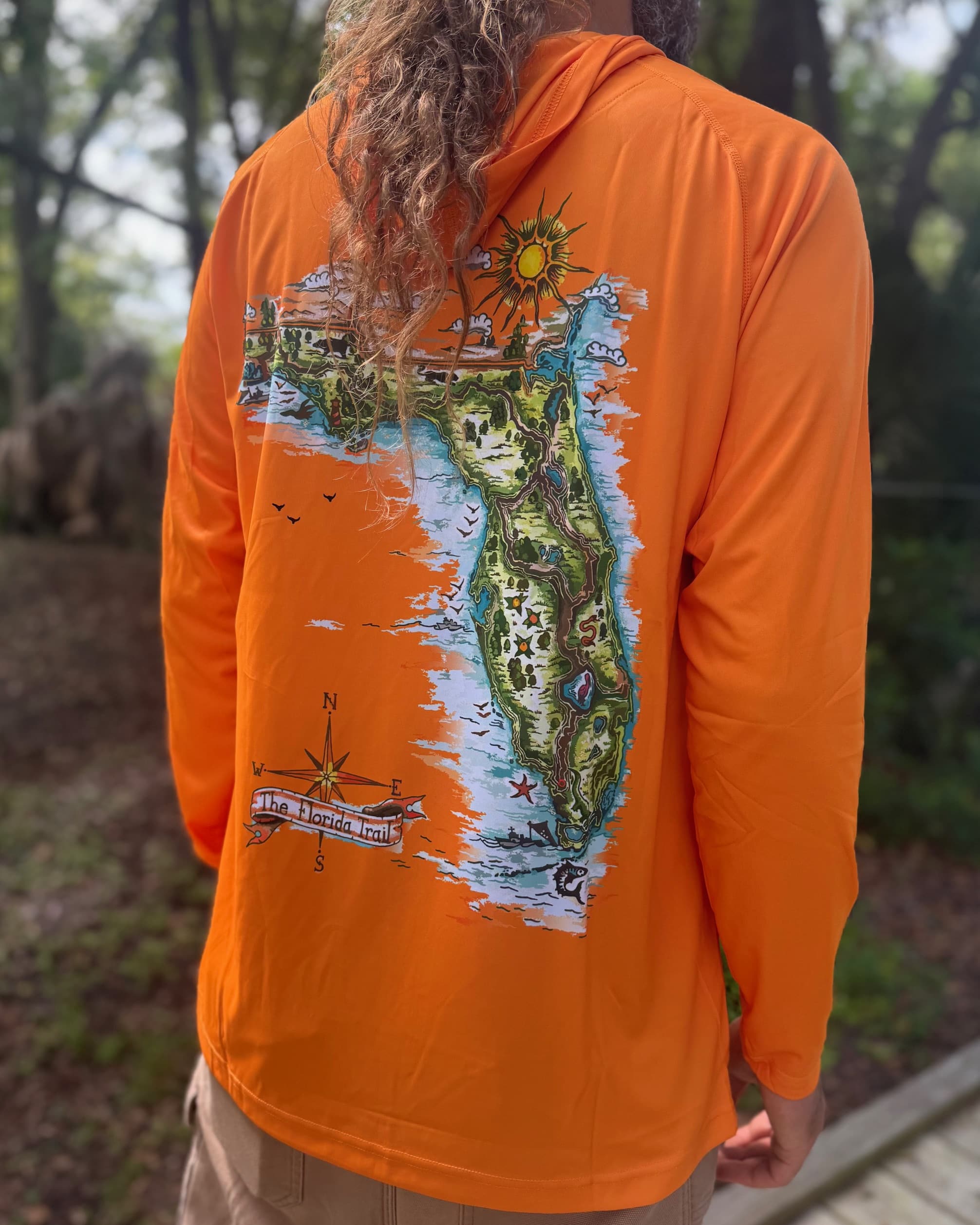 Celebrate your love for the Florida Trail with this lightweight, moisture-wicking hoodie featuring a bold orange color and custom artwork. The back showcases an illustrated map of the Florida Trail, while the front features the Florida Trail Association logo. Made for the outdoors, this sun hoodie moves with you whether you’re trekking through swamps, blazing trail, or hanging with friends after the hike.