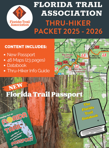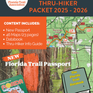 The packet includes 46 detailed color maps (23 double-sided 11″ x 17″ pages) printed on durable, water- and tear-resistant paper, designed to withstand the toughest trail conditions. You’ll also receive the essential Florida Trail Data Book, filled with mileage, resupply points, and key waypoints—plus, we’ve even added a Florida Trail Passport for collecting stamps along your journey.